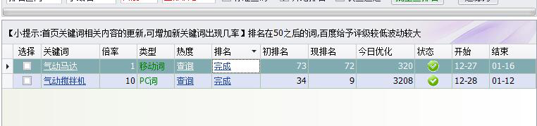 通过我们公司的软件可以很清楚的看到网站关键词的排名情况,已经有1个关键词做到了百度首页的第一名,还有一个气动马达这个关键词一直不太稳定,排名总是时有时无。