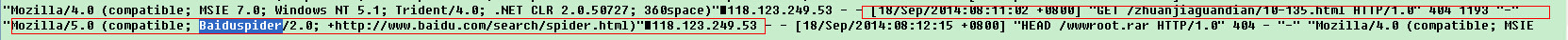 是不是看上去眼花缭乱?不要急,查看这里面的内容其实很简单。我只要查找:baiduspider就够了,如图: